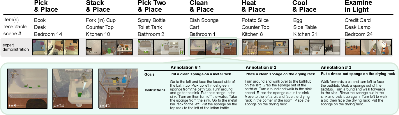 ALFRED includes 25,743 English language directives describing 8,055 expert demonstrations (with 3 or more language annotations each) averaging 50 steps each, resulting in 428,322 image-action pairs. A trajectory consists of a sequence of expert actions, the corresponding image observations, and language annotations describing segments of the trajectory. The default resolution of the RGB input is 300x300 but it is resized to 224 × 224 during training.